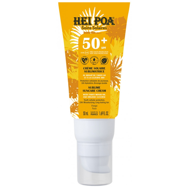 Hei Poa Crème Solaire Visage Sublimatrice SPF50+ 50 ml est un soin solaire très haute protection (SFP50+) pour le visage, revitalisant et anti-âge. Au monoï de Tahiti AO, il hydrate les couches supérieures de l'épiderme tout en protégeant le visage des rayons du soleil. Enrichie à la luzerne Bio, cette crème offre une protection cellulaire anti-âge pour préserver la jeunesse de la peau. Elle répare et régénère le visage des dommages cellulaires et du photo-vieillissement pour une peau revitalisée. Elle révèle un bronzage durable et lumineux pour un hâle sublimé.
