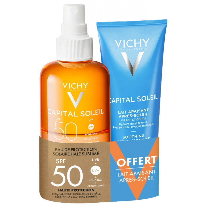 Vichy Capital Soleil Eau de Protection Solaire SPF50 200 ml + Lait Apaisant Après-Soleil 100 ml Offert est un duo de soins solaires spécialement dédié aux peaux sensibles.