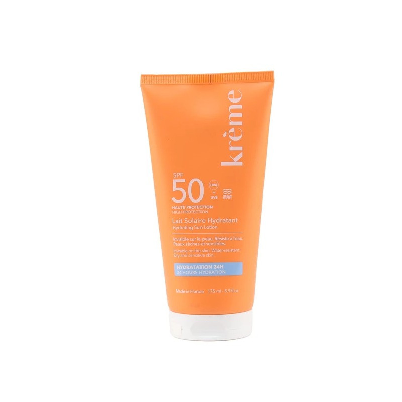 Le lait solaire hydratant SPF 50 Krème a une triple action : il protège la peau des UV, il l'hydrate et il est anti-oxydant. Il agit en laissant un fini non gras invisible sur la peau et il est résistant à l'eau. Il est adapté pour les peaux sèches ayant tendance à perdre facilement leur eau au soleil et pour les peaux sensibles. Il convient dès l'âge de 3 ans. Enfin, il libère un délicat parfum de monoï.