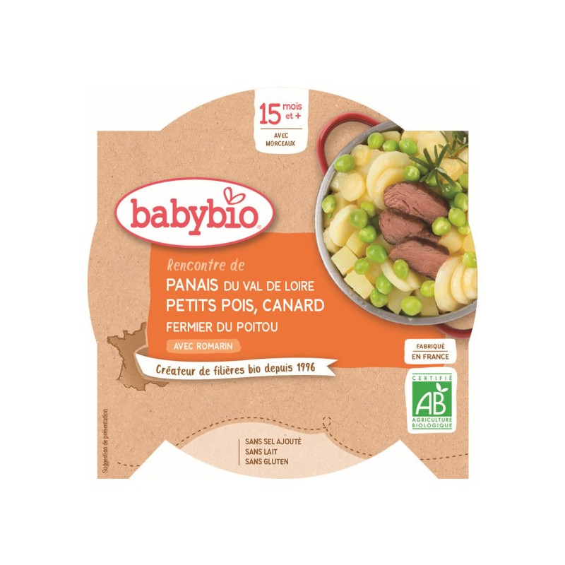 Babybio Menu du Jour Assiette est un plat composé de délicieux morceaux de canard fermier du Poitou accompagnés de son panais et petits pois rigoureusement sélectionnés pour répondre aux besoins de votre enfant.