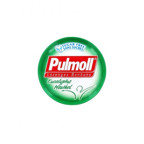 Boite de 45g de pastilles pour la gorge Pulmoll aux arômes naturels de menthol. Les édulcorants contenus dans les bonbons Pulmoll sont extraits de la stévia.