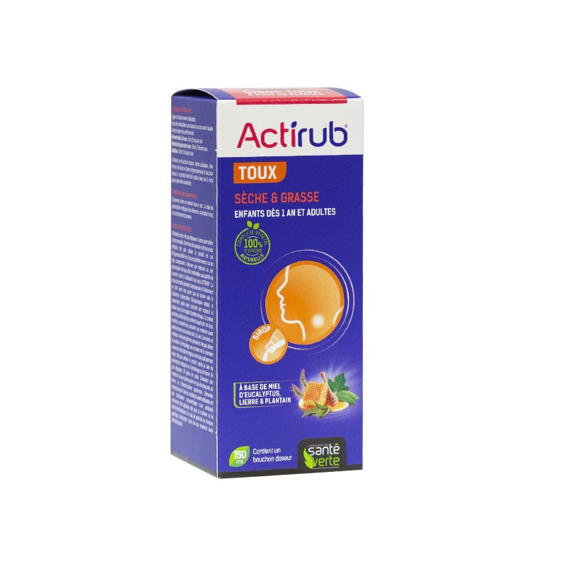 Santé Verte ActiRub Toux Sèche et Grasse, au goût de cerise-griotte, est un sirop à base d'extraits de plantes telles que le plantain lancéolé, le lierre, le marrube blanc, le droséra et le miel d'eucalyptus.