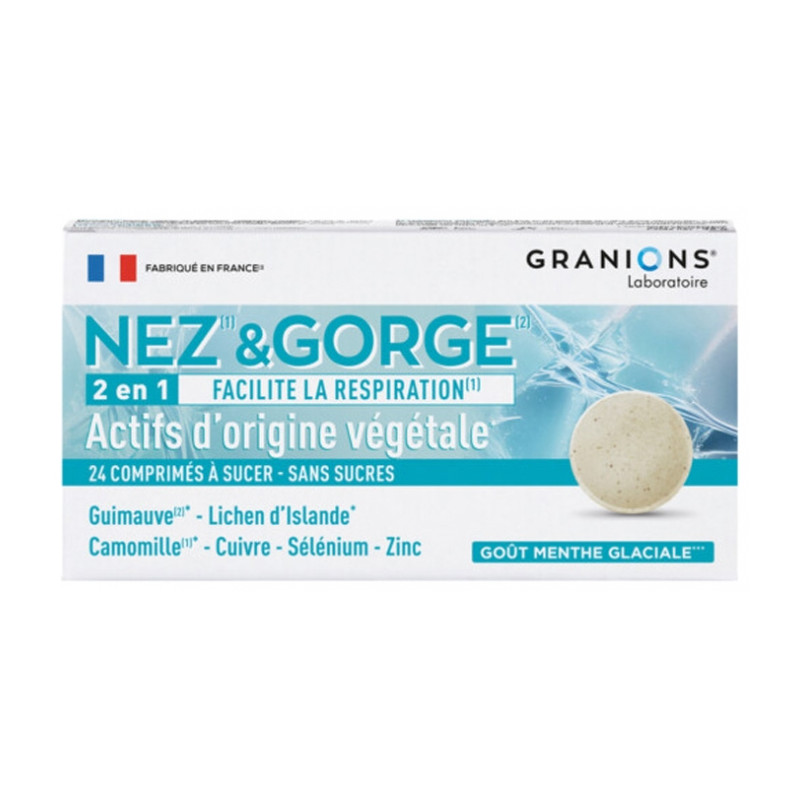 Granions Comprimés à Sucer Nez & Gorge 24 Comprimés est un complément alimentaire à base de guimauve, lichen d'Islande, camomille, cuivre, sélénium, zinc, pour faciliter la respiration.