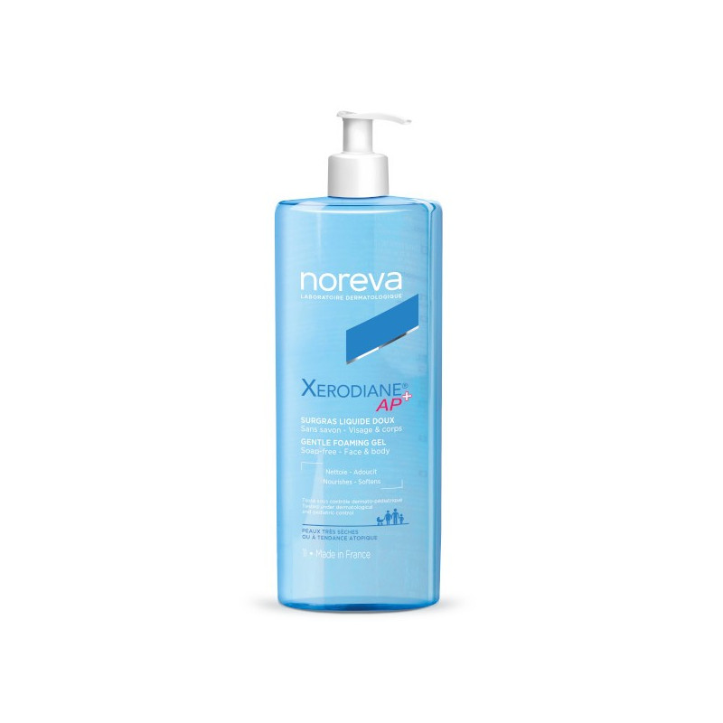 Le Surgras Liquide Doux de la gamme Xérodiane AP+ de NOREVA est parfait pour l'hygiène quotidienne des peaux sèches et très sèches, sensibles et à tendance atopique.