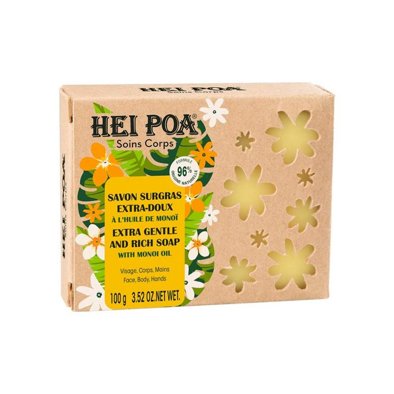 Hei Poa Soins Corps Savon Surgras Extra-Doux Huile de Monoï 100g nettoie en douceur et respecte la peau au quotidien, à partir d'une base végétale.