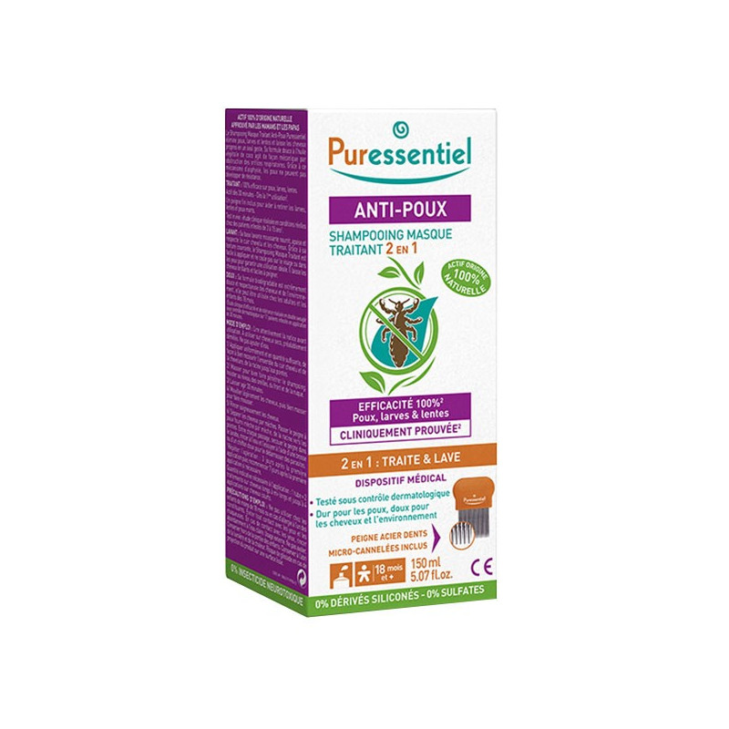 Les laboratoires Puressentiel proposent le Shampooing masque traitant 2en1 pour traiter et éliminer poux, larves et lentes et laver en même temps afin de laisser les cheveux propres en un seul geste.