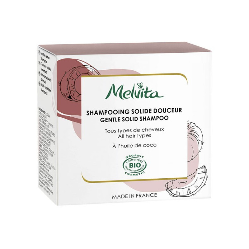 Melvita Shampooing Solide Douceur Bio 55g est enrichi en huile de coco, ce shampooing solide lave en douceur et apporte brillance aux cheveux. Avec son délicat parfum et sa forme ronde, il est aussi agréable que facile à utiliser.
