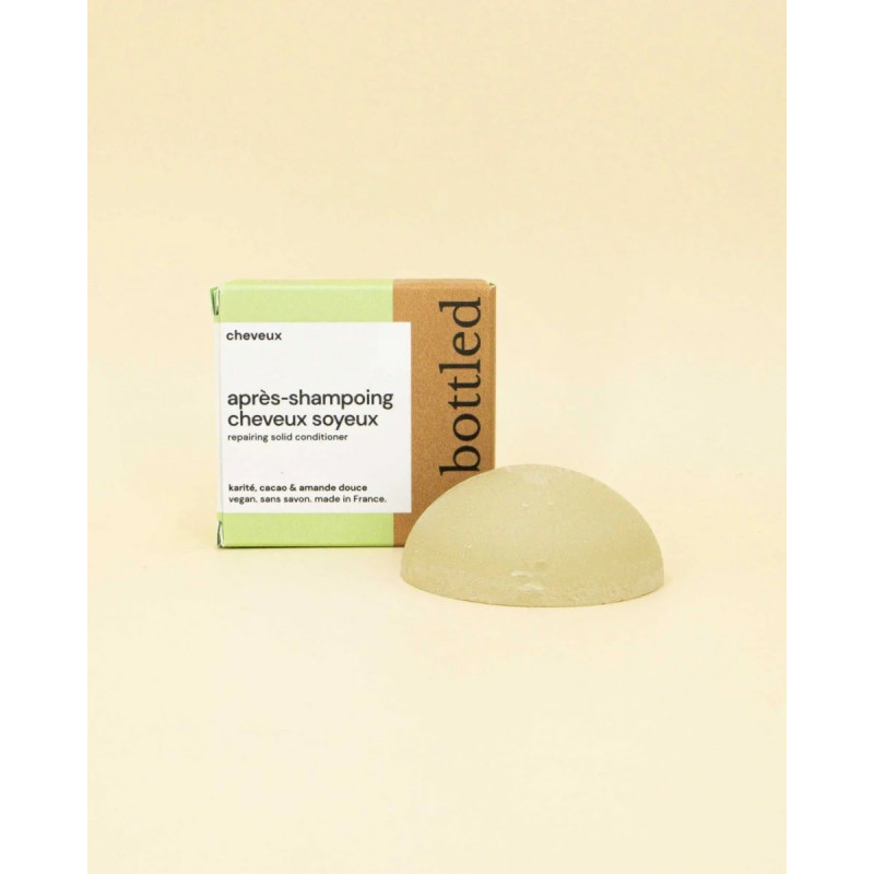 Formulé avec des ingrédients 100% biodégradables, cet après-shampoing solide ne pollue pas les eaux. Son emballage, sans plastique, est conçu avec des matériaux durables et recyclables. Un geste simple pour prendre soin de vos cheveux tout en respectant la planète.