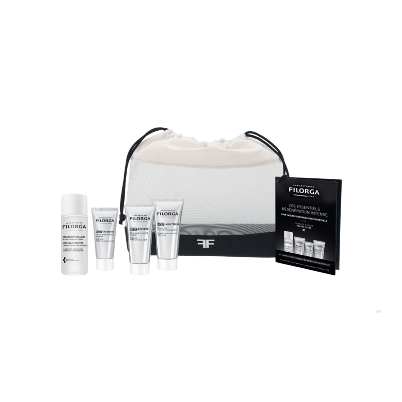 Découvrez vos essentiels régénération intense en format voyage pour emporter partout. Votre routine contient une EAU MICELLAIRE 50ml, le sérum NCEF-INTENSIVE 7 ml, la crème NCEF-REVERSE 7ml et la crème NCEF-NIGHT MASK 15ml.
