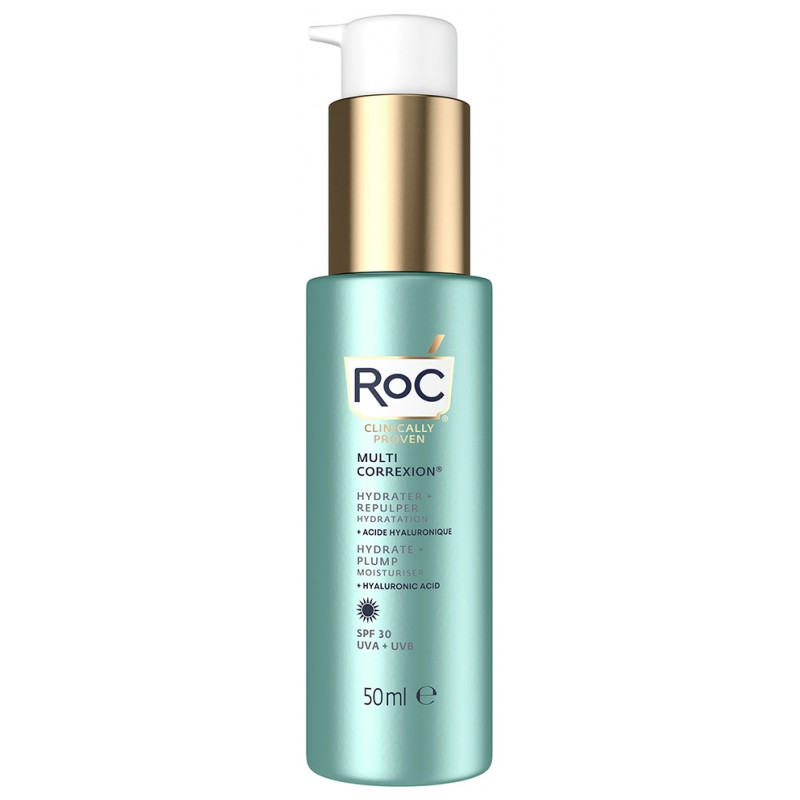 RoC Multi Correxion Hydrater + Repulper Hydratation SPF30 50 ml est un gel crème qui utilise le pouvoir de l'acide hyaluronique pour apaiser la peau et repulper instantanément les rides et ridules tout en offrant une protection contre les UVA/UVB.