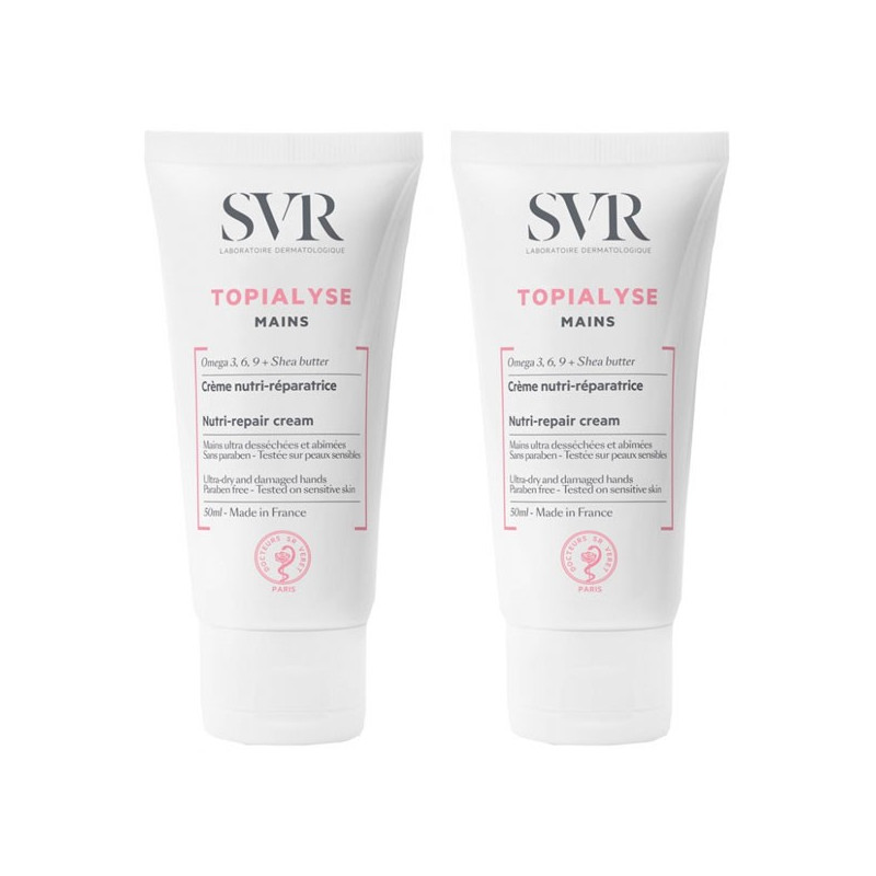 SVR Topialyse Mains Crème nutri-réparatrice Oméga 3,6,9 et beurre de Karité Mains ultra désséchées et abîmées SVR Topialyse Crème Nutri-Réparatrice Mains 50 ml a été spécialement conçue pour nourrir et réparer les mains ultra desséchées et abîmées de toute la famille. Sa formule enrichie en oméga 3, 6, 9 et en beurre de karité offre un confort extrême et laisse un agréable et délicat parfum sur les mains. Les mains sont plus souples et plus douces, immédiatement et durablement. Formule sans paraben, hypoallergénique, testée sur peaux sensibles. Made in France.