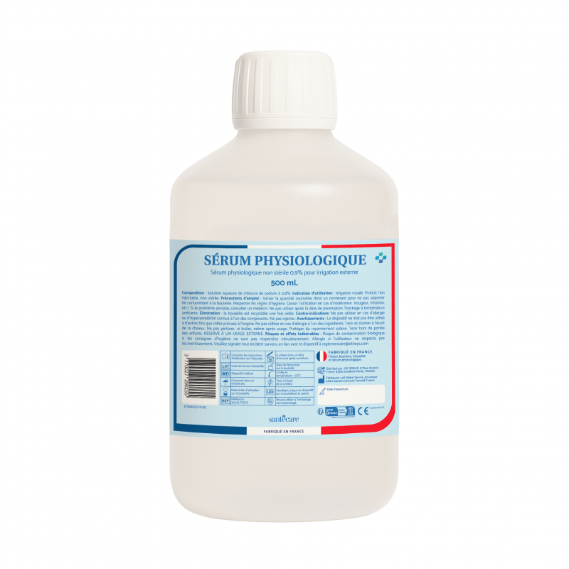 Le sérum physiologique en flacon de 500 ml permet d'irriguer et de nettoyer le nez. À utiliser avec une seringue nasale