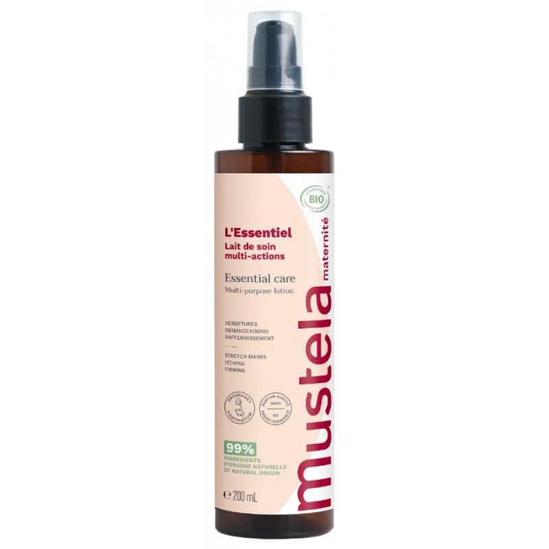 Mustela Maternité L'Essentiel Lait de Soin Multi-Actions Bio 200 ml est un soin qui répond aux besoins essentiels de la peau pendant et après la grossesse.