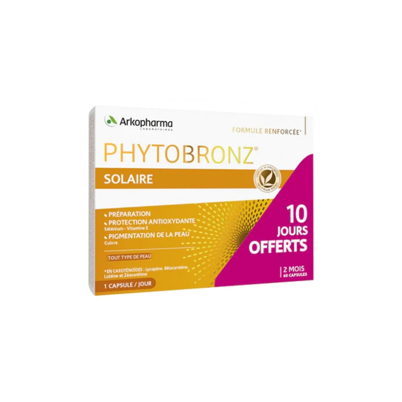 Arkopharma Phytobronz 60 Capsules dont 10 Capsules Offertes est un complément alimentaire qui associe un mélange d'actifs, dont des caroténoïdes 100% d'origine végétale, du cuivre et du sélénium pour :