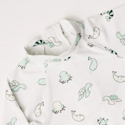 Découvrez notre nouveau t-shirt anti-UV UPF50+, idéal pour protéger bébé des rayons du soleil et décoré de notre joli imprimé Marin avec ses petits animaux aquatiques.