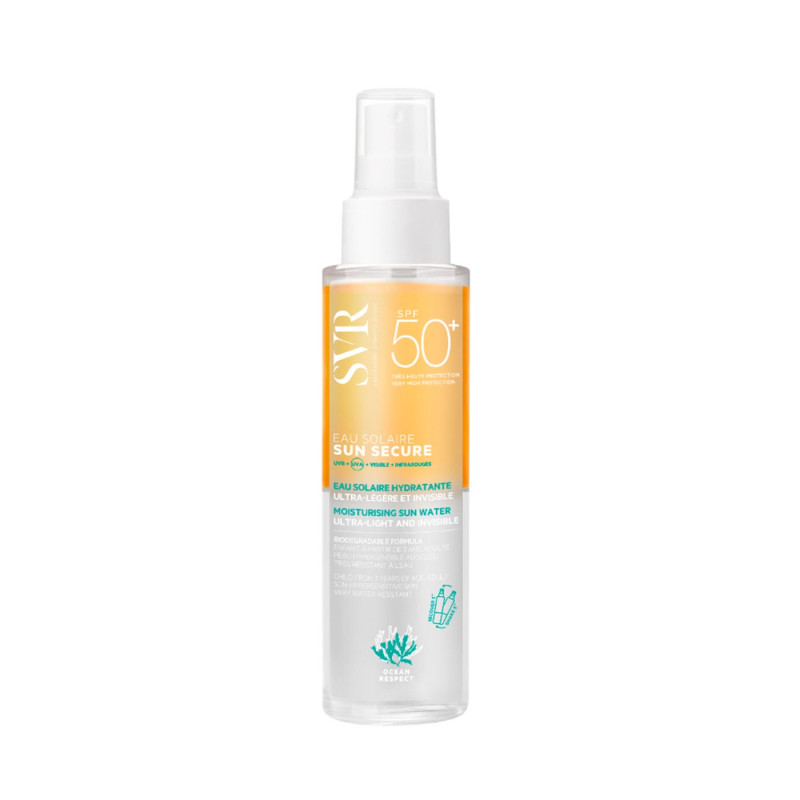 Les laboratoires SVR ont mis au point l'Eau solaire Sun Secure SPF 50+ qui assure une très haute protection solaire contre les rayons ultraviolets UVA et UVB. Elle protège tous les types de peau, et plus particulièrement les plus sensibles. Vous pouvez utiliser l'Eau solaire protectrice Sun Secure aussi bien sur votre visage que sur votre corps. Elle est non comédogène. Dès l'application, elle procure une sensation de fraîcheur immédiate qui apaise et protège. En outre, elle offre également une action hydratante. L'eau solaire SPF 50+ Sun Secure est très résistante à l'eau et résiste aussi à la transpiration, au sable et aux frottements. De plus, elle est biodégradable.