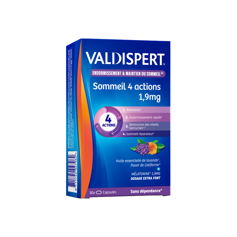 Valdispert Mélatonine 1,9 mg 4 Actions 30 Capsules est un complément alimentaire sous forme de capsule à base de Mélatonine, d'huile essentielle et de plante.