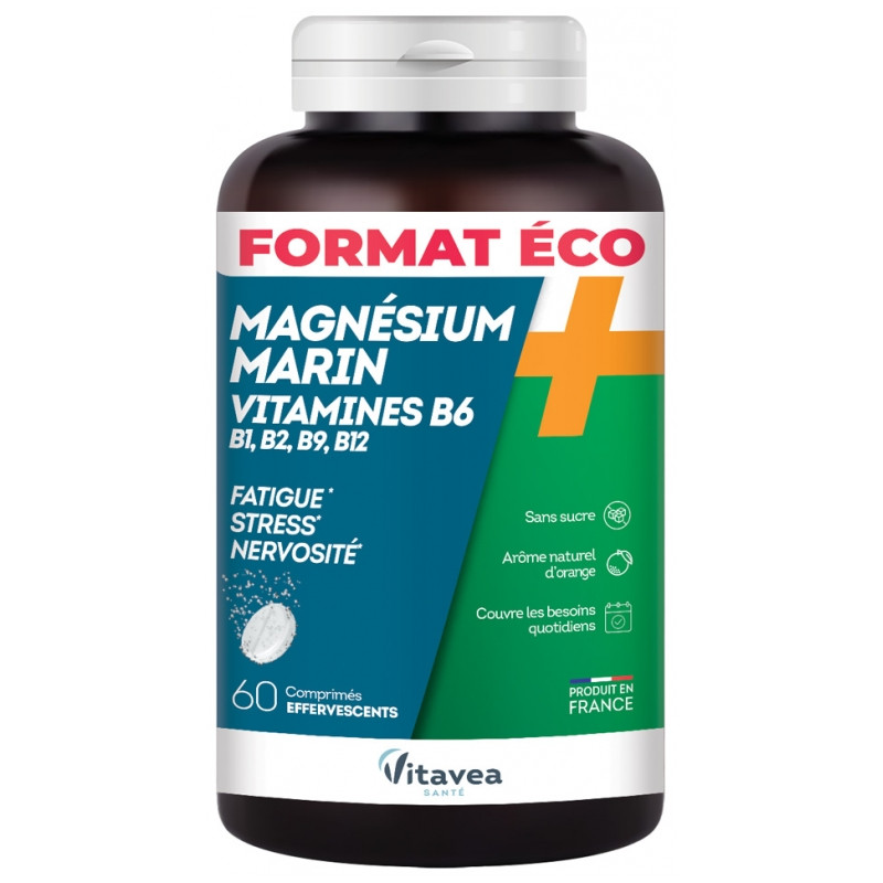 Vitavea Magnésium + Vitamines B1 B2 B6 B9 B12 60 Comprimés Effervescents est un complément alimentaire à base de magnésium et de vitamines B1, B2, B6, B9 et B12 avec édulcorants, à l'arôme naturel d'orange.