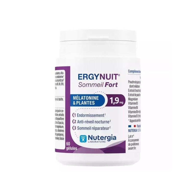 La formule de ErgyNuit® Sommeil Fort est renforcée en mélatonine et en apporte 1.9 mg par jour (2 gélules). La mélatonine aide à s’endormir plus rapidement (l’effet bénéfique est obtenu par la consommation de 1 mg de mélatonine juste avant le coucher).