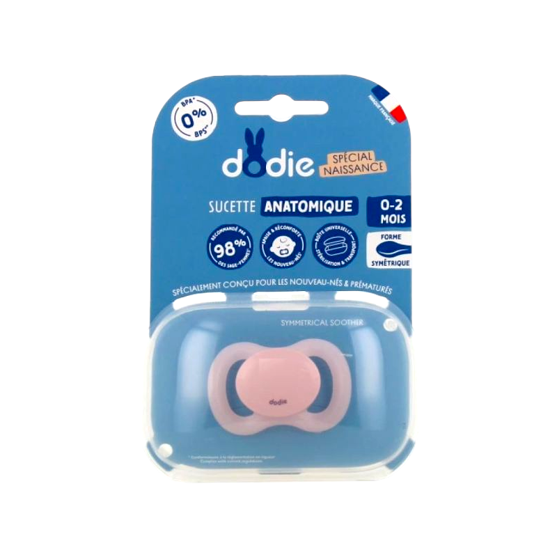 Sucette anatomique naissance 0-2m en silicone Dodie spécialement développée pour les nouveau-nés et les bébés prématurés.