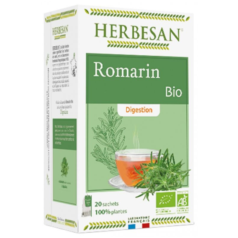 Herbesan Infusion Romarin Digestion Bio 20 Sachets est une infusion monoplante à base de romarin Bio. Le romarin aide à soutenir la digestion.