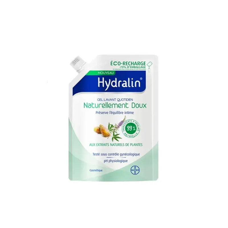 Eco Recharge Gel lavant quotidien Naturellement Doux Hydralin, soin d'hygiène intime qui nettoie les muqueuses en douceur et préserve l'équilibre intime avec son pH physiologique adapté à un usage quotidien. Utilisé au quotidien, Hydralin adoucit et préserve la flore de votre intimité.