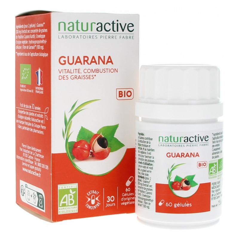 Naturactive Guarana Bio 60 Gélules est un complément alimentaire à base de guarana, qui contribue à la réduction de la fatigue physique et mentale, et au maintien de la vigilance. Il est connu pour activer la dépense énergétique de l'organisme et favorise la combustion des graisses.