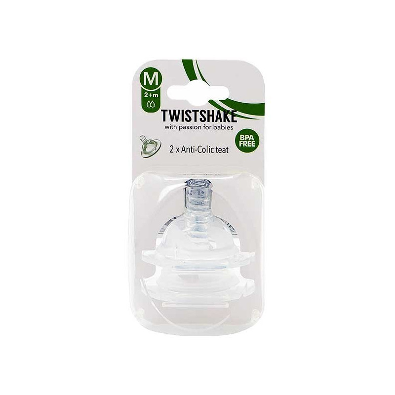 Twistshake Tétine Anti-Colique Débit M +2m Lot de 2 est un lot de tétines en silicone ultra souple anti-colique, équipées du système TwistFlow avec valve à air pour un débit régulier sans air dans l’estomac fragile de votre bébé.