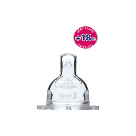 La Tétine Plate col large débit rapide de la gamme SENSATION+ de DODIE reproduit la forme aplatie du sein pendant la tétée pour une meilleure adaptation à la bouche de bébé. Son système double valve anti-colique breveté intégré et son embout large apportent un confort essentiel au bébé.