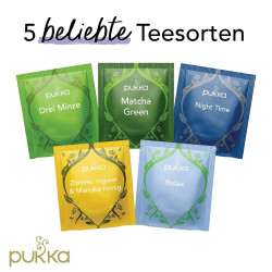 L'assortiment Pukka Favourites regroupe les thés et infusions Pukka les plus populaires. Ainsi, vous retrouverez dans cet assortiment 5 thés et infusions Pukka :