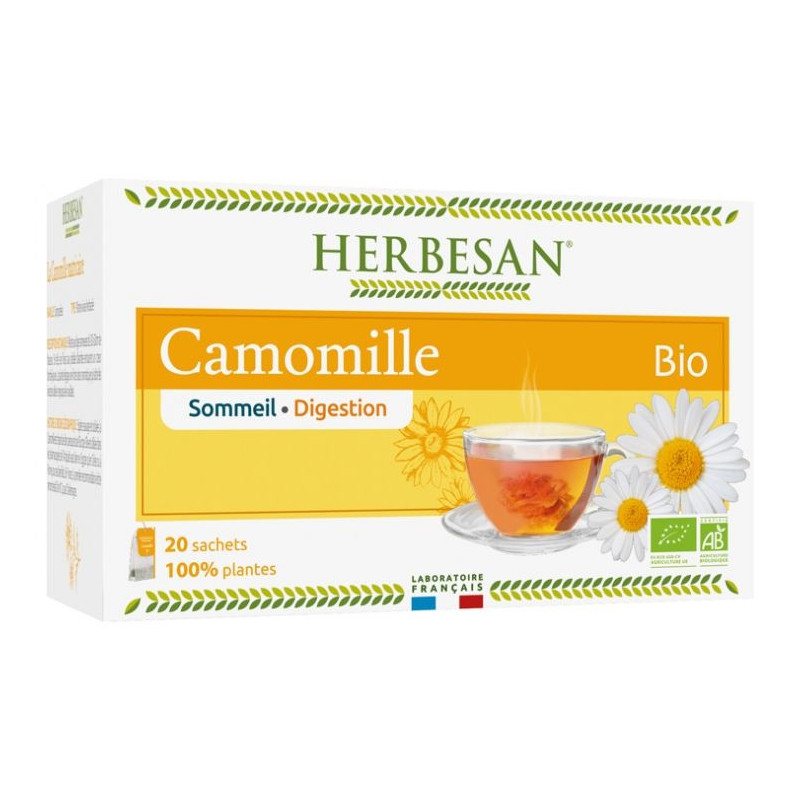 Herbesan Infusion Menthe Poivrée Bio 20 Sachets est une infusion monoplante à base de camomille Bio qui contribue à un sommeil serein et favorise la digestion.