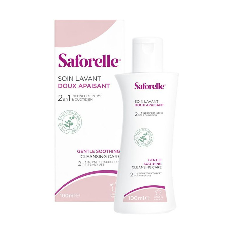Saforelle Soin lavant doux nettoie en douceur et calme les irritations et les démangeaisons.