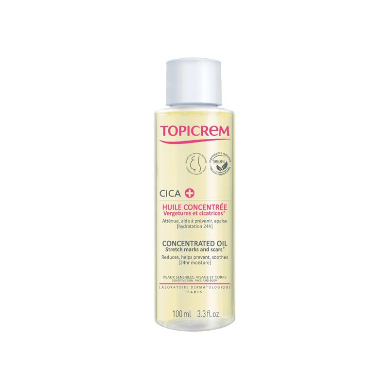 Topicrem Cica Huile Concentrée Vergetures et Cicatrices 100ml atténue, aide à prévenir et apaise. Ce soin quotidien ultra-riche nourrit et hydrate la peau 24H et prévient de l'apparition des vergetures, atténue visiblement vergetures et cicatrices déjà existantes et apaise la peau.