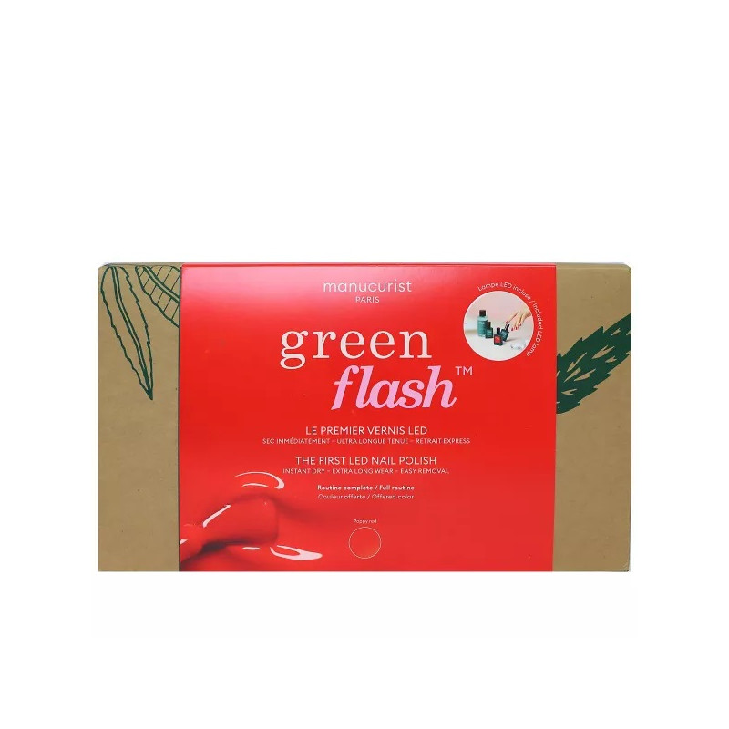 Le kit de vernis semi-permanent Green Flash de la marque Manucurist vous propose tous les éléments indispensables pour une routine complète de semi-permanent à la maison, de la pose au retrait : base, couleur, top coat, lampe LED, dissolvant et pinces de retrait.