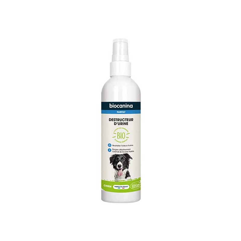 Biocanina Destructeur d'Urine Chien Bio 240ml est un spray formulé à base d'huiles essentielles (citronnelle, eucalyptus), d'eaux florales (menthe poivrée et romarin) et de vinaigre Biologique. Il permet de lutter contre les odeurs d'urine de chiens.