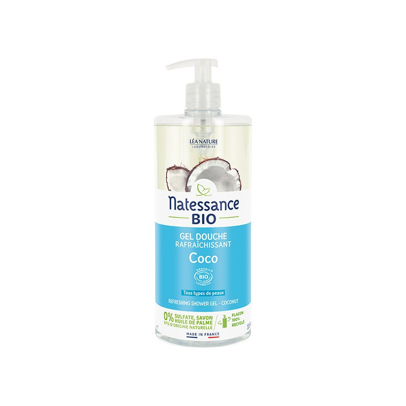 Natessance Gel Douche Rafraîchissant Eau de Coco Bio 1 L est un gel douche à base lavante issue de la noix de coco pour une origine végétale et une formulation sans huile de palme, ni dérivés. Il nettoie la peau efficacement tout en respectant l'équilibre cutané.