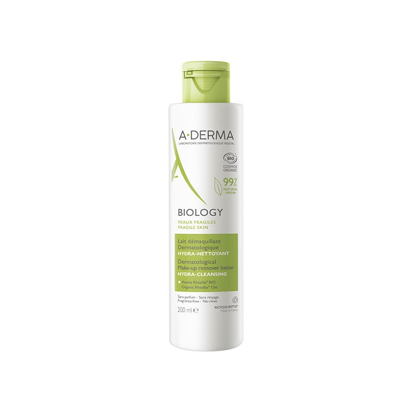 Pour démaquiller et nettoyer efficacement et avec une extrême douceur les peaux fragiles du visage, A-DERMA a formulé BIOLOGY Lait démaquillant dermatologique hydra-nettoyant. Véritable prouesse formulatoire, ce lait démaquillant à 99% d'origine naturelle, à la tolérance optimale, conjugue l'exigence et l'efficacité dermatologique à la certification BIO dans une texture lactée et non collante.