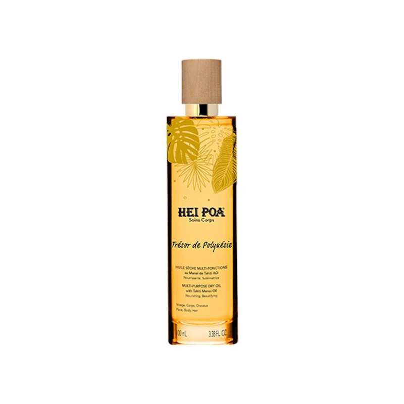 Véritable Trésor de Polynésie, Hei Poa Huile Sèche Trésor de Polynésie est riche en monoï de Tahiti AO, nourrit, hydrate* et sublime le visage, le corps et les cheveux.